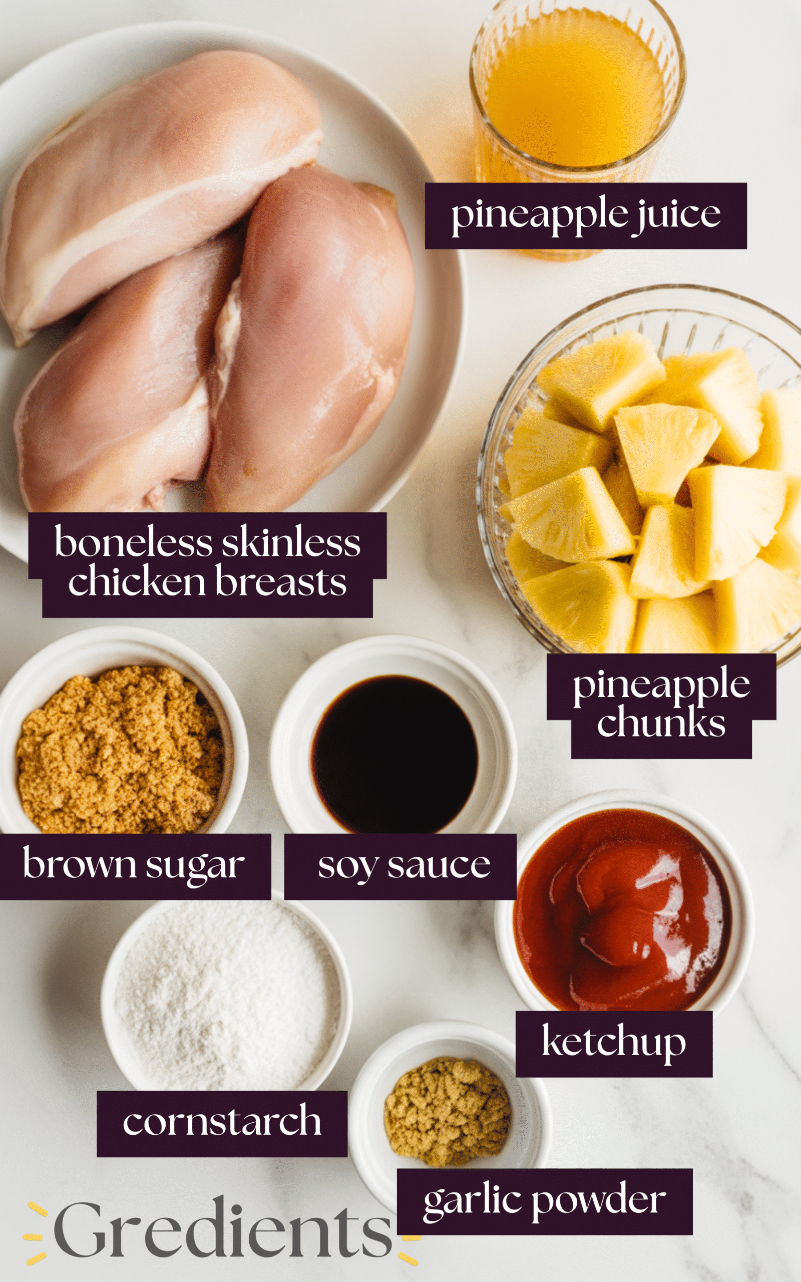 It is made of chicken pineapple, soy sauce, brown sugar, and a few simple seasonings.