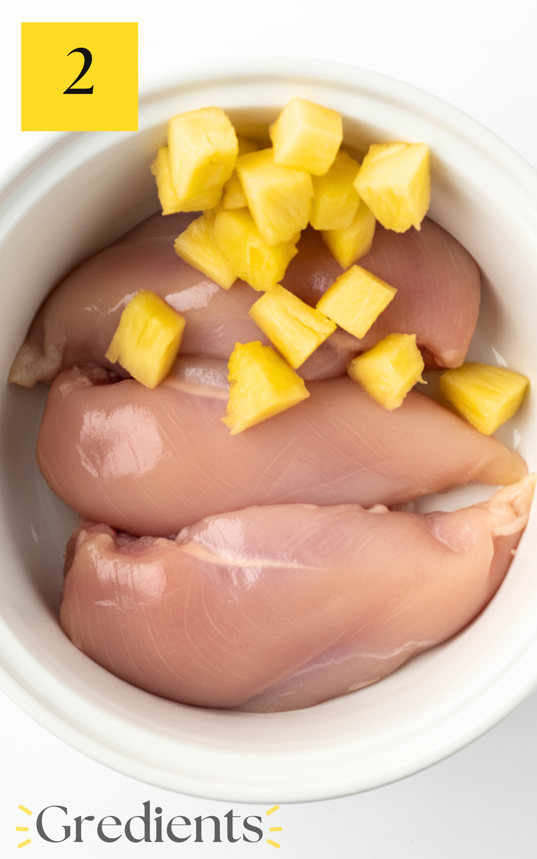Add the pineapple chunks over the chicken so each piece of meat gets some of the sweet fruit.