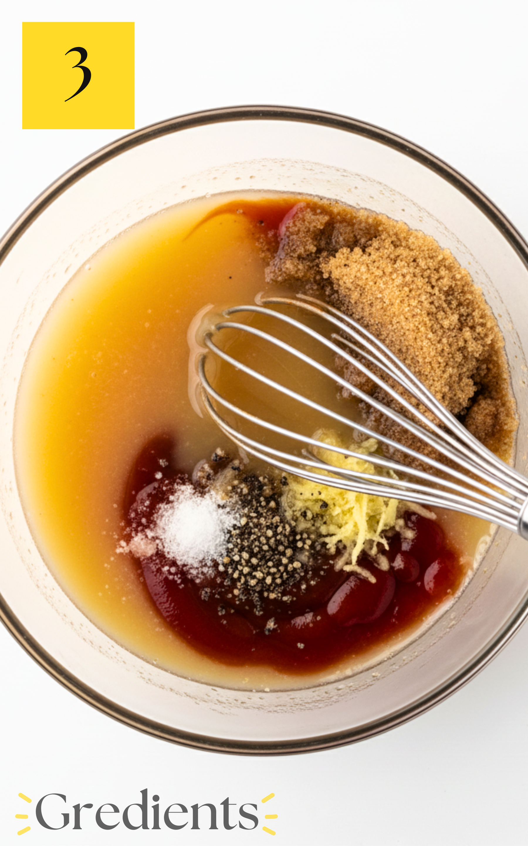 In a small bowl mix pineapple juice brown sugar soy sauce ketchup garlic powder ginger salt and pepper together until the sauce looks smooth and brown.