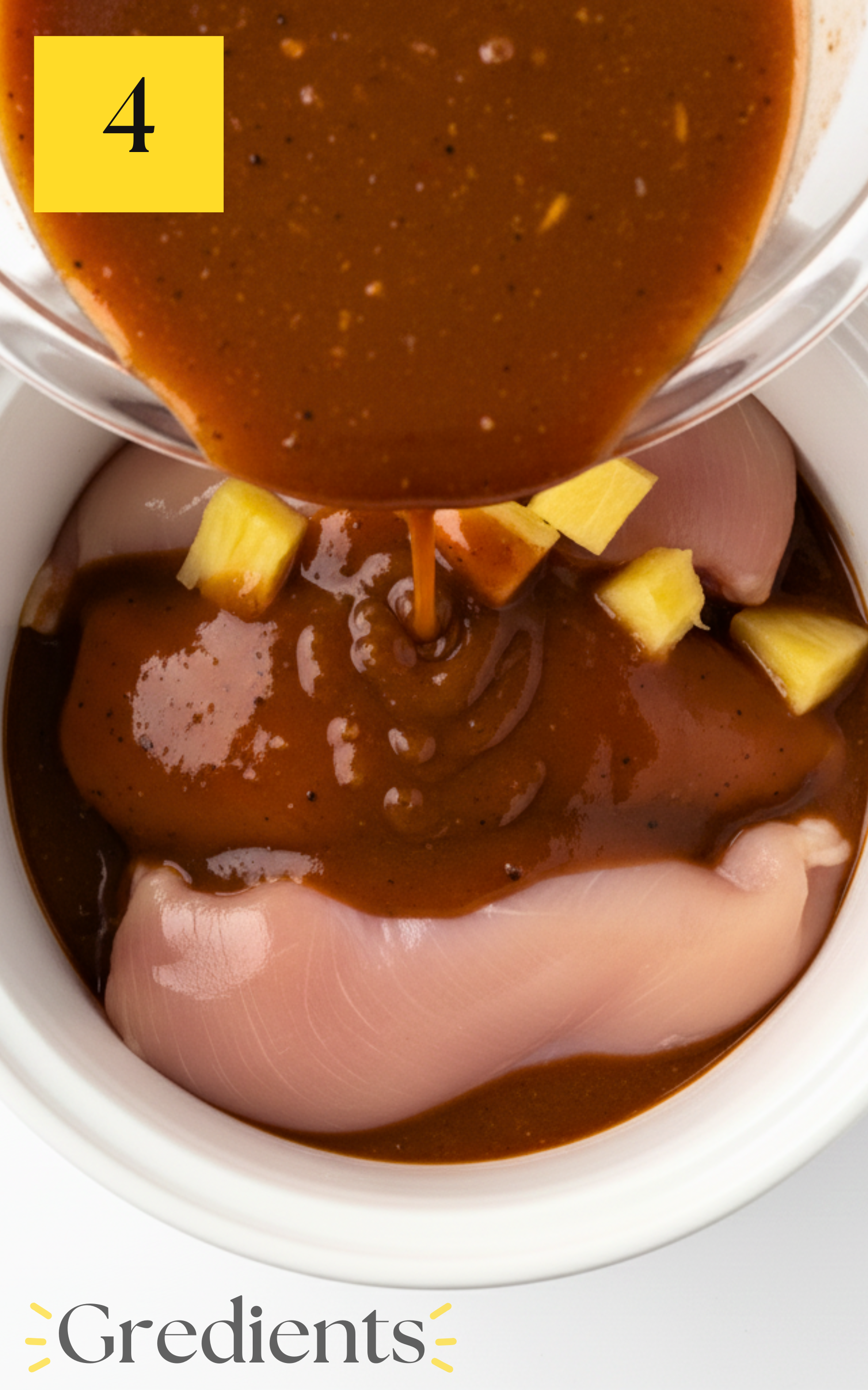 Pour the sauce over the chicken and pineapple so it spreads all around and covers everything.