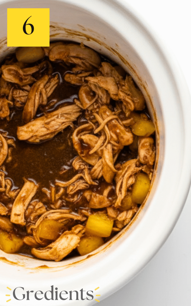 Put the lid on the crockpot and cook on low heat for 6 hours or on high heat for 3 hours until the chicken becomes soft.